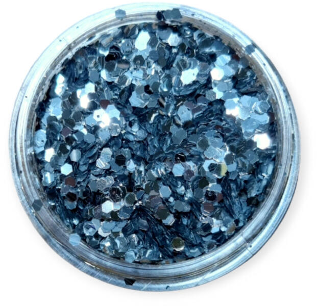 Ezüst színű nagyszemcsés csillámok zárható tégelyben. Előszeretettel használják felnőttek és tinik egyaránt. Alkalmazható fesztivál sminkhez, arc és testfestéshez kiegészítőként, haj díszítésként. Anyaga 100% polietilén-tereftalát, biztonságosan használható bőrön és hajon egyaránt gyermekeknek is. Méret: kb. 1 mm-s csillámok Szín: ezüst