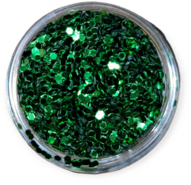 Zöld színű nagyszemcsés csillámok zárható tégelyben. Előszeretettel használják felnőttek és tinik egyaránt. Alkalmazható fesztivál sminkhez, arc és testfestéshez kiegészítőként, haj díszítésként. Anyaga 100% polietilén-tereftalát, biztonságosan használható bőrön és hajon egyaránt gyermekeknek is. Méret: kb. 1 mm-s csillámok Szín: zöld