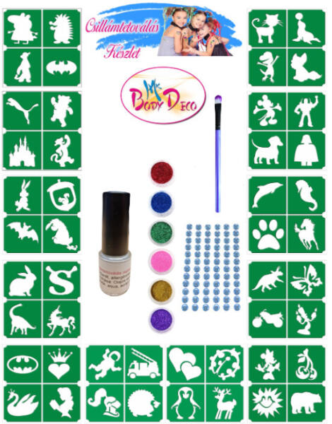 Ebben a készletben vegyes mintákkal állítottunk össze sablonokat, csillámtetoválás ragasztót, általános színeket tartalmazó csillámporokat, ecset készletet. Továbbá még található benne strasszkövek, hogy még egyedibb legyen a csillántetoválásod. Mindezeket organza tasakba csomagoltuk neked. Hogy mit tartalmaz a csillámtetkó szett?