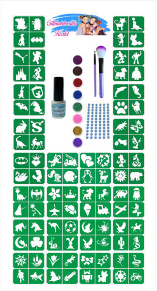 Csillámtetoválás óriás készlet – Kreatív és tartós csillogás otthon A csillámos tetoválás készlet fő jellemzői: Ezt az óriás csillámtetkó készletet, vegyes mintákzatúsablonokkalállítottunk össze, továbbá a csillámtetoválás készítéséhez elengedhetetlen csillámtetoválás ragasztót, általános színeket tartalmazó csillámporokat és ecset készletet. Ráadásként strasszköveket is kapsz a szettben. Mindezeket organza tasakba csomagoltuk neked. Hogy mit tartalmaz a csillámtetkó szett?