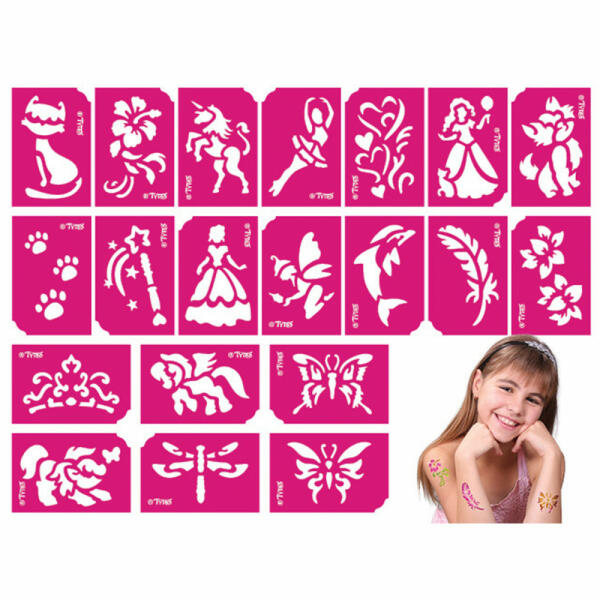 A sablon szett 21 db, 3-8 éves lányoknak készült mintát tartalmaz, melyeket használhat csillámtetováláshoz, vagy egyéb testfestéshez. Olyan slágermintákat kap egy csomagban, mint a cica, pillangó vagy póniló, melyek biztos örömet szereznek a kislányoknak.
