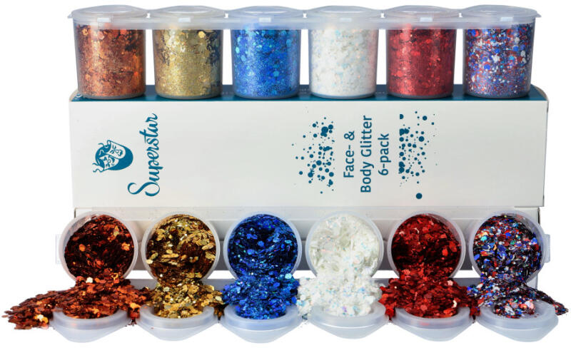 A minőségi arc és testfestékeiről híres Superstar közösen, a holland Sabine Gabriëlle Vogel "csillám királynővel" együtt csodálatosan csillogó nagyszemcsés csillám variációkat készített különböző alkalmakra. Kiszerelés: 130 ml /6x21.6 ml/ Színek: arany, piros, fehér, kék, narancs, multi color. Előszeretettel használják felnőttek és tinik egyaránt. Alkalmazható fesztivál sminkhez, arc és testfestéshez kiegészítőként, haj díszítésként. Anyaga 100% polietilén-tereftalát, biztonságosan használható bőrön és hajon egyaránt gyermekeknek is.