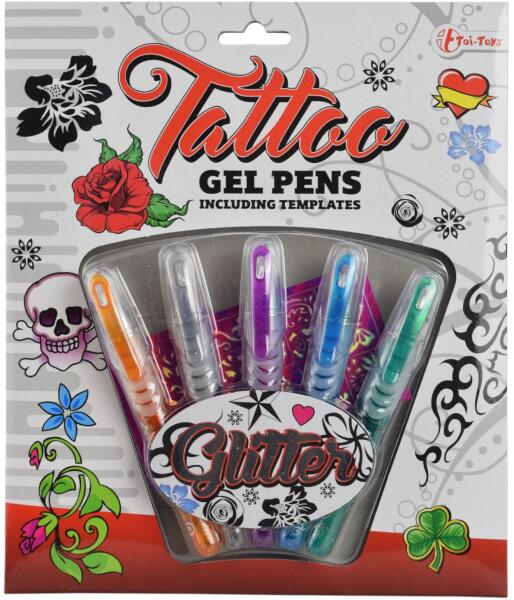 A csomag tartalma 5 csillámos gél toll és 1 lap tetoválás sablon. A sablon a bőr felett tartva töltsük ki a formát a tollak egyikével.