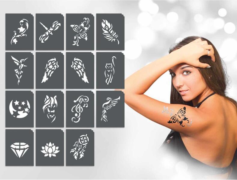 A csomagban található sablonok segítségével női csillámtetoválás mintákat készíthet, melyeket egyéb testfestéshez is felhasználhat.