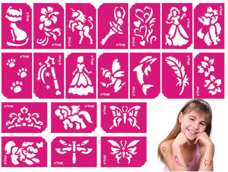 Sablon szett - lányoknak - 21 db-os A sablon szett 21 db, 3-8 éves lányoknak készült mintát tartalmaz, melyeket használhat csillámtetováláshoz, vagy egyéb testfestéshez. Olyan slágermintákat kap egy csomagban, mint a cica, pillangó vagy póniló, melyek biztos örömet szereznek a kislányoknak.